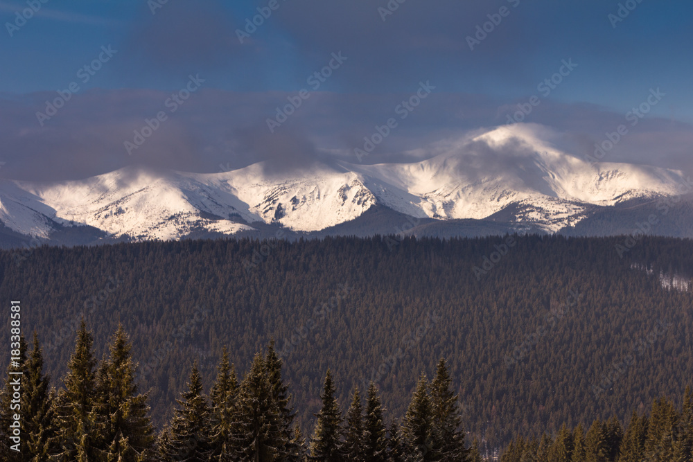 Foggy winter landscape in the mountains.Picturesque and gorgeous wintry scene. View of forest hills covered by snow and hoarfrost.