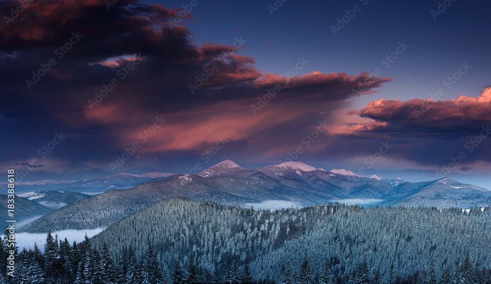 Panoramic view of dramatic sunset in the winter mountains. Wooded hills covered with snow, fog rising from valleys, colorful cloudy sky - this is impressive picture.