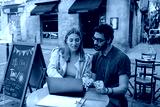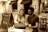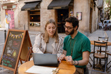 Man and woman looking at laptop and sitting at table