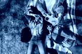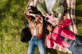 A group of three female friends pose in front of a phone held by one of them while they gesturing and lie on a blanket with their heads next to each other
