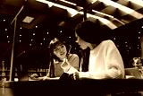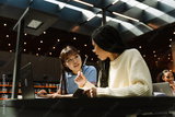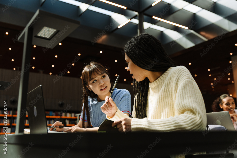 Female student listening to female student talking and holding a notebook while they hold pens and sit at a table in front of a laptop
