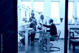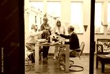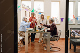 A group of four friends laughing and talking while holding glasses while two of them are standing and two of them are sitting at a table