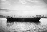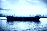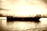 Cargo ship and dry bulk vessel at sunset. Export or import in Asia. Grain or wheat transportation. Phnom Penh city skyline in the background in Cambodia. Food or general carrier in Mekong river.
