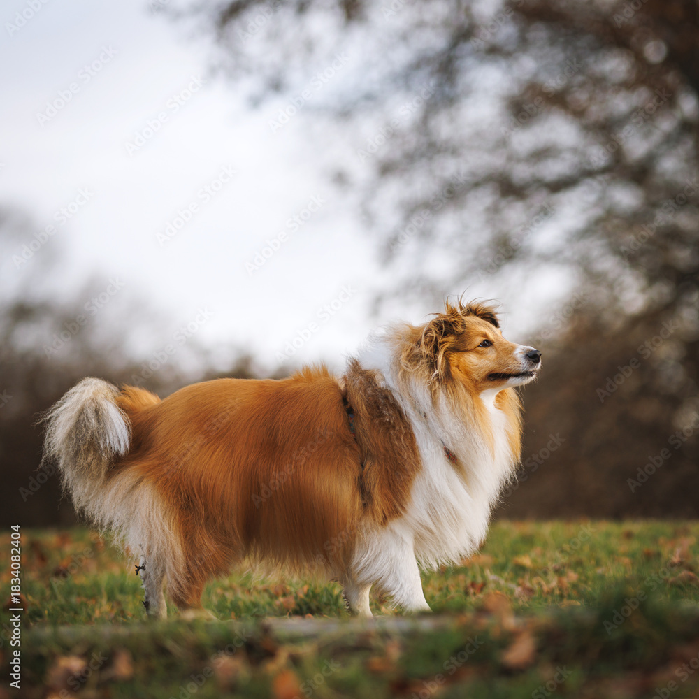 Shetland Sheepdog Standing on Meadow in Soft Light