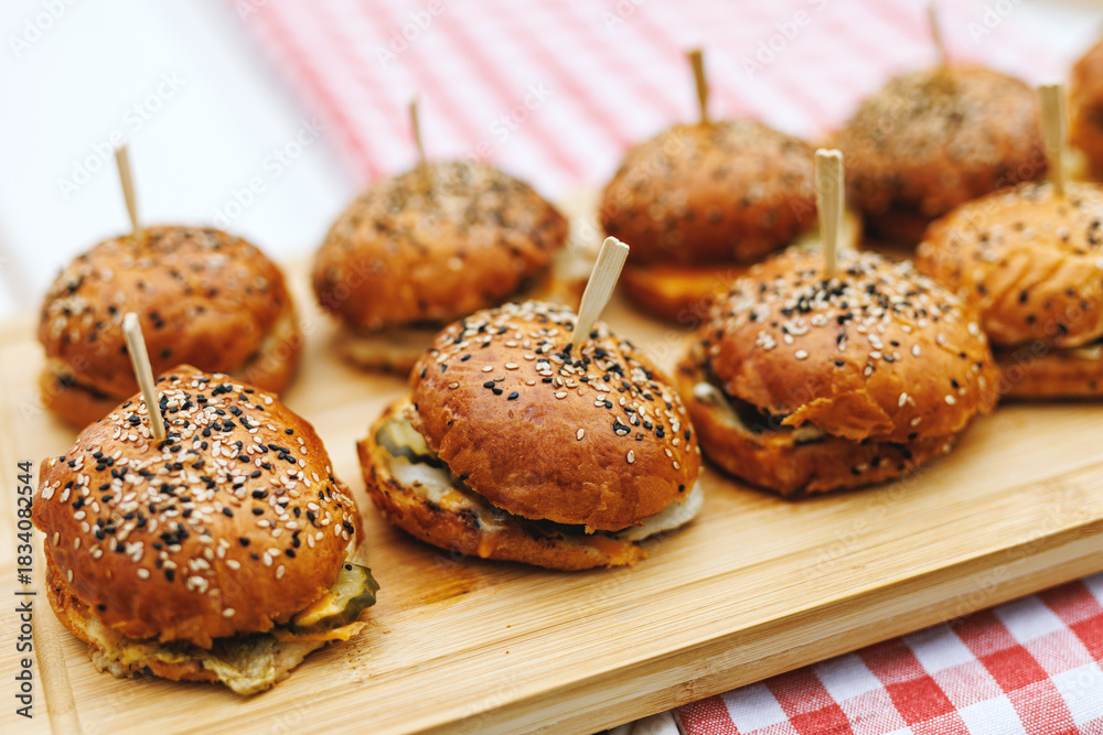 Mini Sesame Burgers on Wooden Serving Board