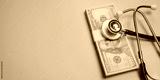 Medical cost concept with stethoscope on stack of hundred dollar bills on pink background, symbolizing healthcare expense and financial health management