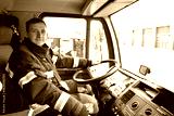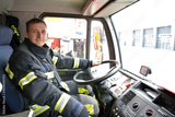 Firefighter at the wheel of an emergency vehicle drives to the scene of action and extinguishes fire