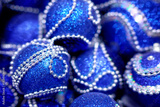 A vibrant assortment of blue glitter ornaments wrapped with silver bead garlands creates a rich, festive mood ideal for holiday decor, Christmas scenes, and winter celebrations.