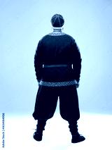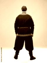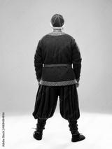 Rear View of Person in Traditional Medieval-Inspired Clothing on Neutral Background