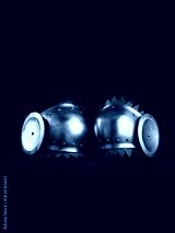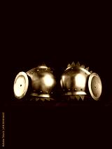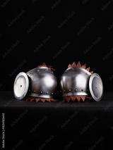 Matching steel shoulder pauldrons with rondel discs and decorative leather edging, set against a dark background for dramatic contrast.