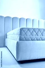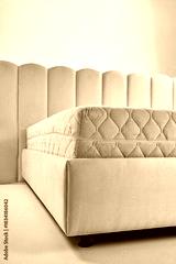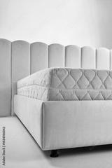 A cozy bed featuring a soft upholstered frame and intricately patterned mattress, ideal for relaxation. The setup evokes comfort and style, suiting modern interior design aesthetics.