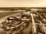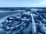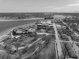 Fort Gratiot Lighthouse aerial view at the entrance to the St. Clair River from Lake Huron, with Blue Water Bridge at the distance, in city of Port Huron, Michigan MI, USA.