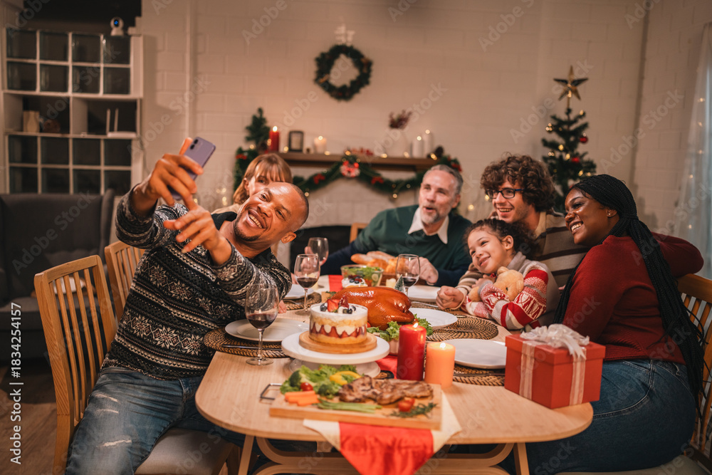 Family celebrates Christmas and New Year by exchanging gifts, sharing smiles and laughter, enjoying a festive meal, and creating warm memories full of love and togetherness