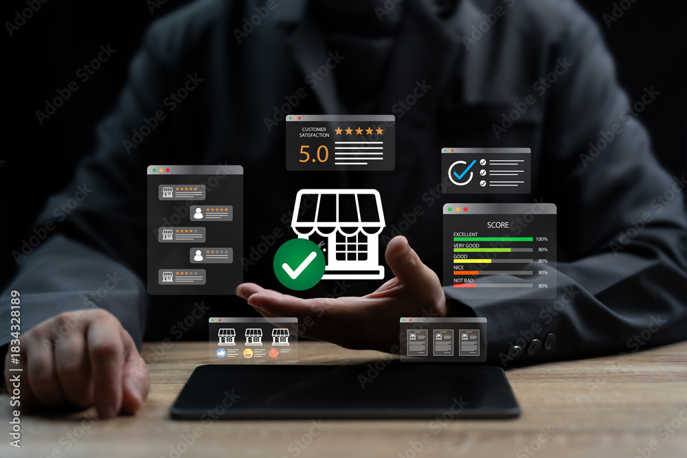Customer Satisfaction Rating and Store Reliability, Businessman Verifying Shop Credibility, Reviewing Customer Feedback, Rating Scores, Guarantee Standards to Ensure Trustworthy Products and Services