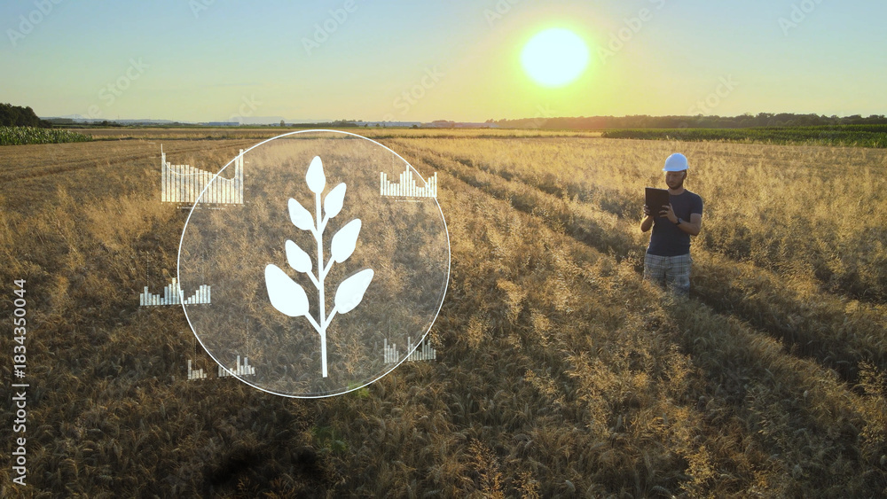 Agricultural engineer checks wheat growth progress on tablet during sunset in golden field. Smart farming concept