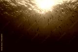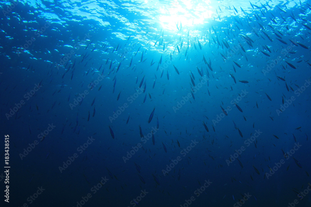 Underwater sunburst and fish