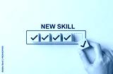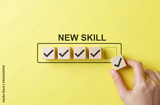 New skill development and learning progress concept with hand placing checkmark block on checklist against yellow background, symbolizing self-improvement, upskilling, goal setting, and career growth.