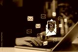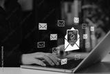 Verified email communication and digital messaging concept, showing a woman using laptop with multiple email icons and a confirmed email symbol, representing secure mail delivery and inbox management