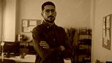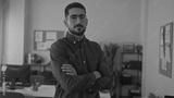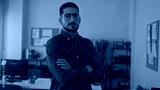 Young man with beard and glasses adjusting shirt and crossing arms in modern office setting, showcasing confidence and professionalism in an indoor workplace environment.