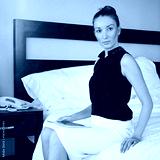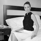 Tablet, portrait and business woman in hotel room for hospitality review, quality manager and research. Guest feedback, booking checklist and motel report with person in bed for reservation planner