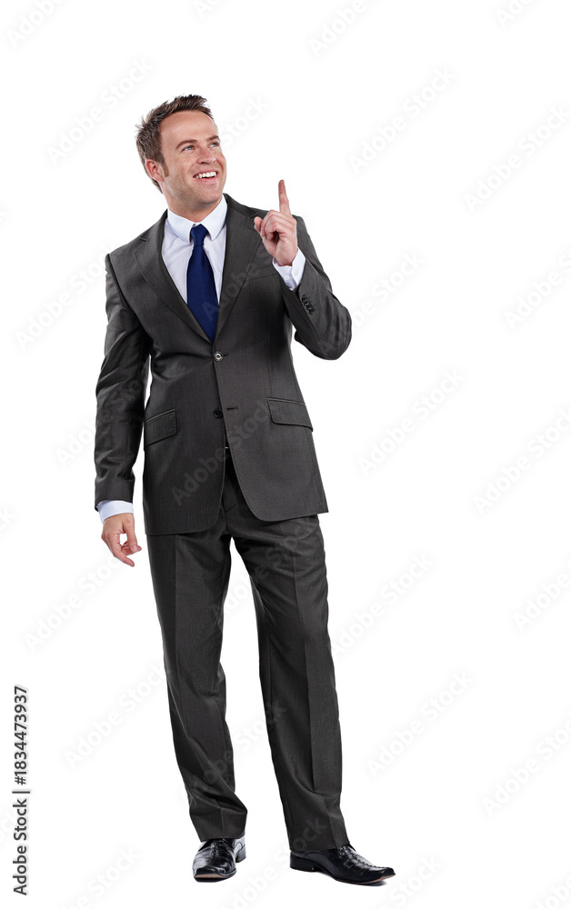 Pointing, thinking and businessman in studio with ideas, decision or choice for finance career. Corporate, planning and male financial manager with brainstorming for project by white background space