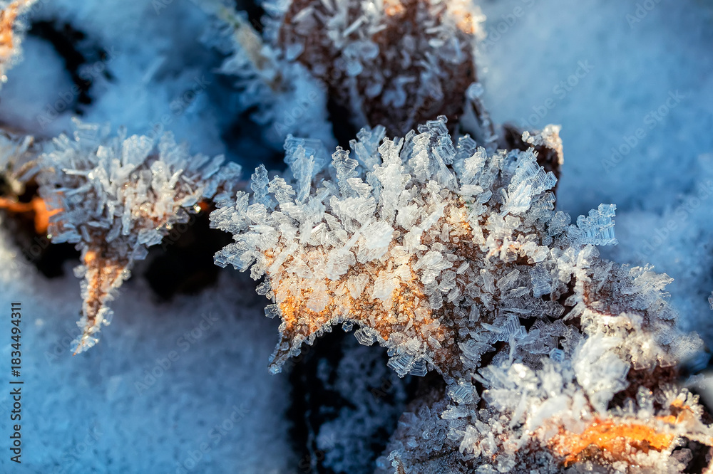 nature with shiny crystals of cold transparent blue hoarfrost cover fallen leaves in autumn park