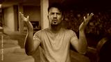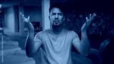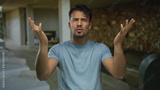 Young hispanic man in blue shirt expressing confusion indoors at spa pool setting with arms raised, conveying contemplation in a serene atmosphere.