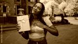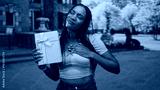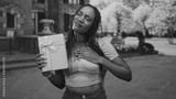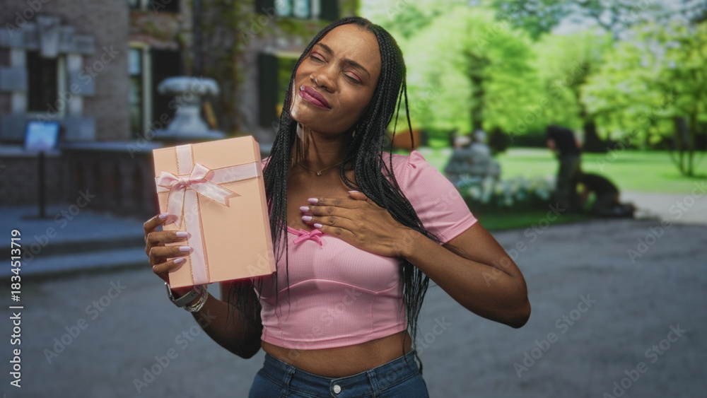 Black woman holds a pink gift box with ribbon, hand pressed to chest gesture, wearing pink shirt and jeans, standing in front of a building; gratitude celebration.