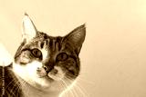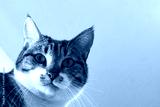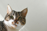 Tabby cat face close up. Happy cat relaxing at home.