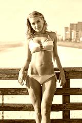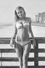 Portrait, bikini and woman at beach for vacation paradise, travel and summer style on island. Confidence, swimsuit and girl by ocean for adventure on holiday trip, tourism and fashion in California