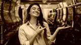 Woman finger pointing to open palm beside glowing slot machine reels in a vibrant casino; excitement.
