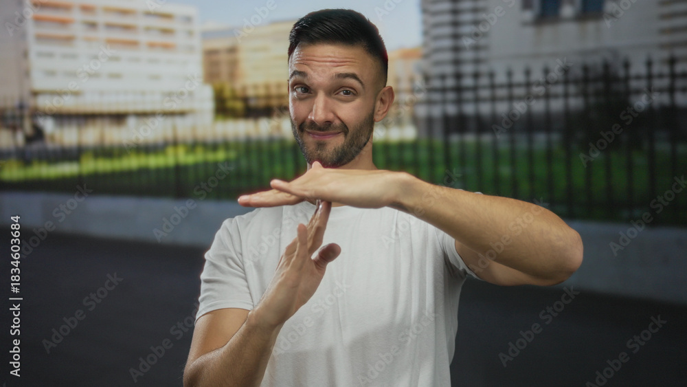 Young man gestures time out on street in urban city with smile wearing white shirt outdoors under sunlight