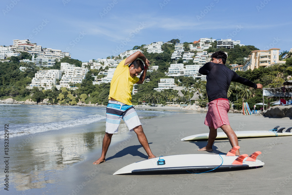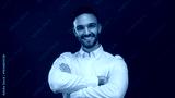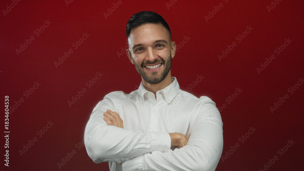 Hispanic man smiling confidently in a white shirt with arms crossed against a vibrant red background, exuding positivity and charm.