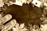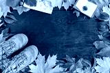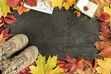 Autumn leaves, tracking boots and maps on a black background of an old tree
