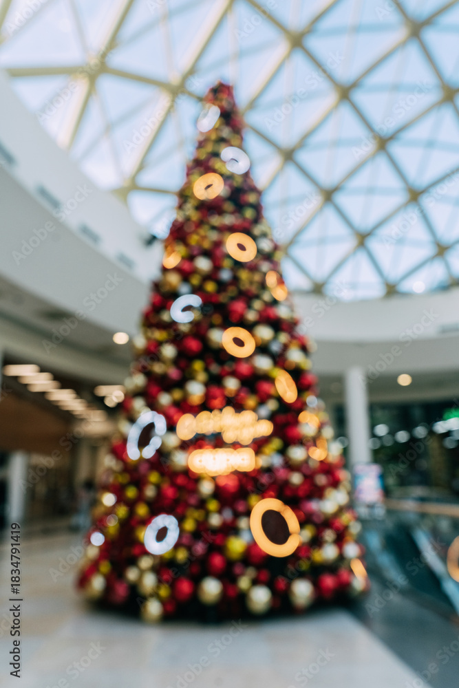 Giant blurred christmas tree in shopping mall with decorative lights, festive Sparkle Blurred Background
