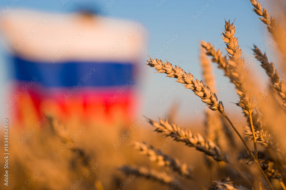 A man with a Russian flag in a wheat field at sunset. A man holding golden wheat stalks against the backdrop of a ripening field.The concept of planting and harvesting a bountiful harvest.Patriotism.