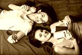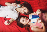 Two cheerful friends girls holding passports, plane tickets and globe lying on red bed, indoor travel concept