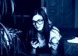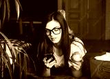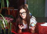 Beautiful girl wears glasses holding phone and globe, travel concept