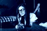 Beautiful girl wears glasses holding phone and globe, travel concept