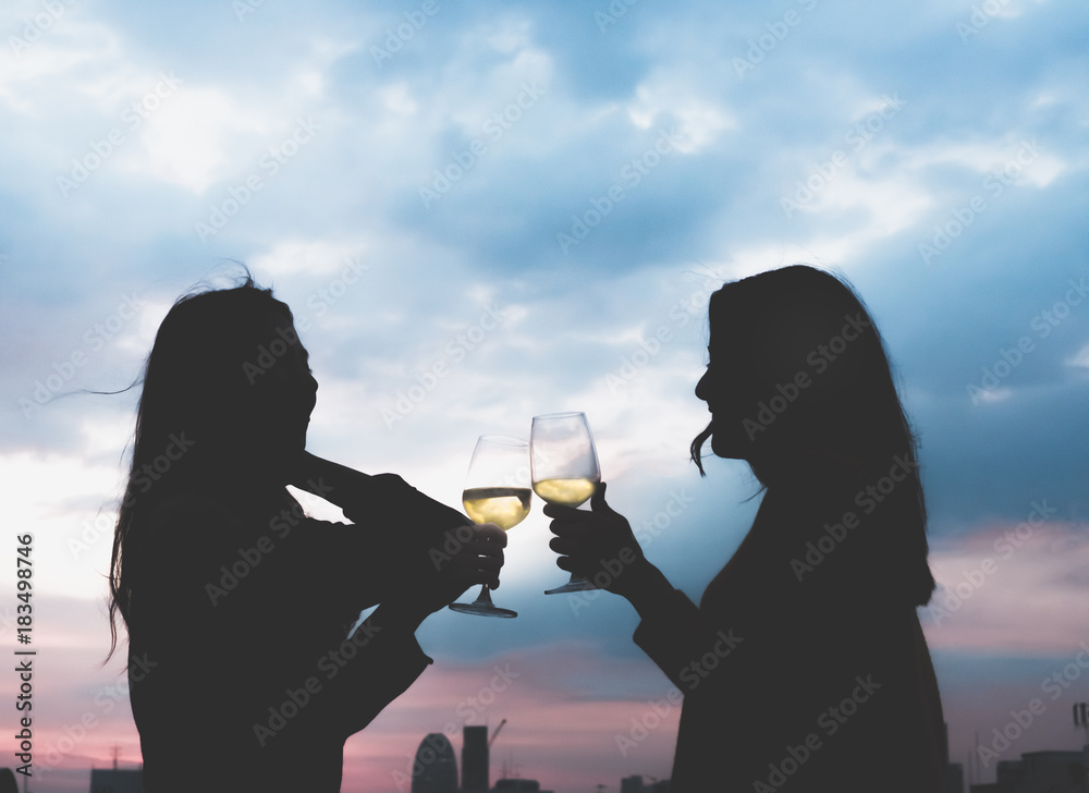 silhouette two asia lesbian lgbt couple toast champagne glass at rooftop party in sunset evening time,love wins,enjoy and cheerful lifestyle,birthday or anniversary party concept