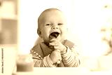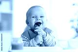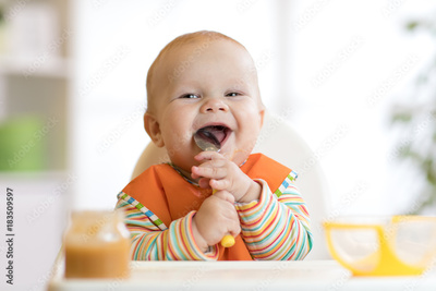 Cheerful baby child eats food itself with spoon. Portrait of happy kid boy in high-chair.