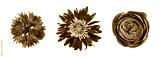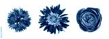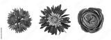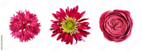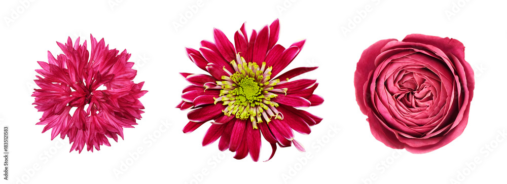 Set of different red flowers (knapweed, rose, chrysanthemum) isolated on white or transparent background. Top view.