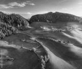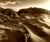 Aerial view of green alpine valley at sunset with scattered villages, fields, forests and rolling hills in Dolomites, Italy. Scenic rural mountain landscape with colorful autumn nature. Top drone view