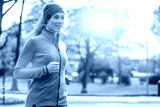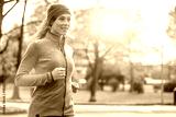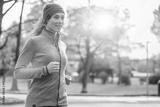 young beautiful caucasian woman jogging workout training. Autumn running fitness girl in city urban park environment with fall trees orange. Sunset or sunrise warm light. Sport activity in cold season
