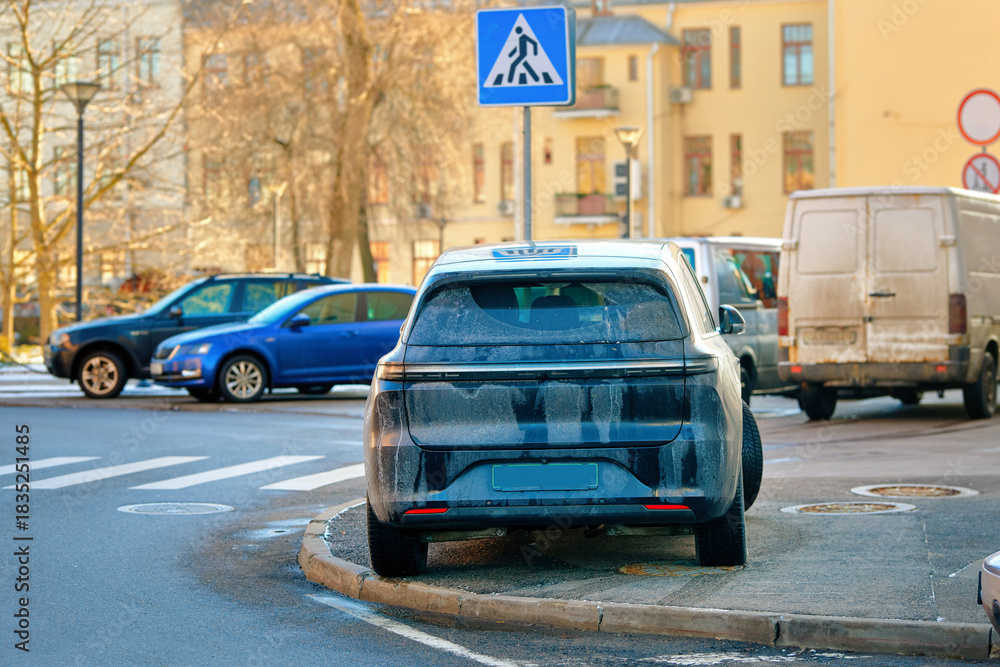 Car parked illegally on sidewalk near pedestrian crossing creating serious visibility hazard for drivers and pedestrians, traffic risks, potential fines or towing consequences. Improperly parked SUV