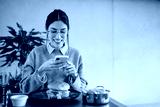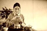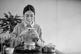 Woman smiling while taking a picture of her burger and fries with a smartphone at a restaurant, sharing her dining experience online