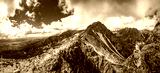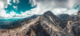 Mountain stone range peak against blue cloudy sky. Nature landscape. Travel background. Holiday, hiking, sport, recreation. National Park High Tatra, Slovakia, Europe. Vintage retro toning filter