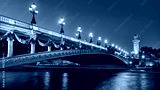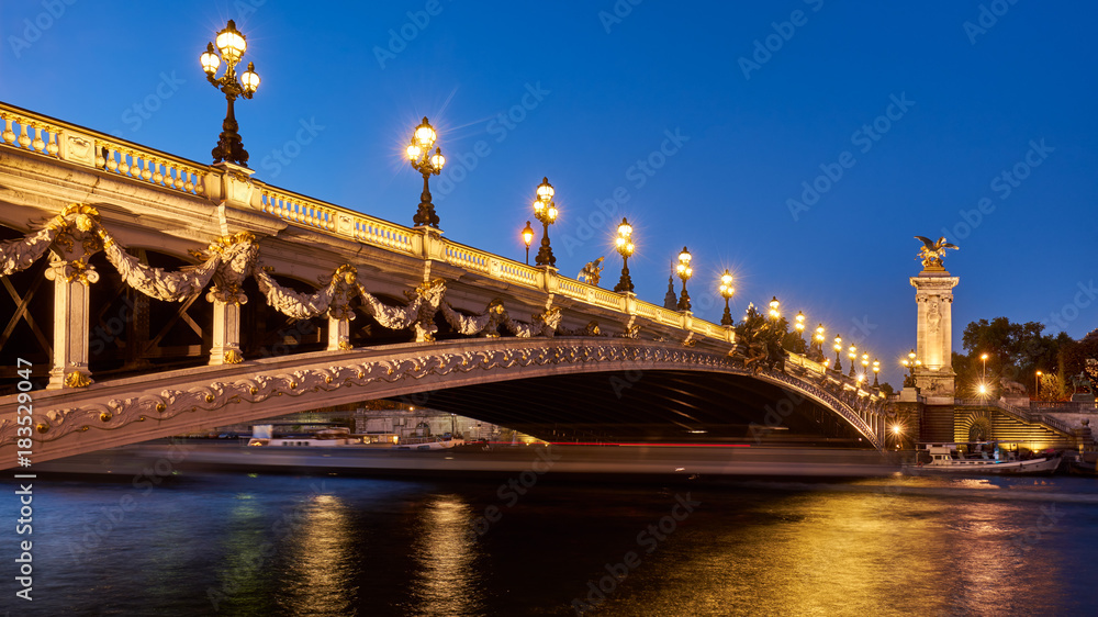 Panoramic view of the Pont Alexandre III bridge illuminated in evening with the Seine River. 8th Arrondissement, Paris, France