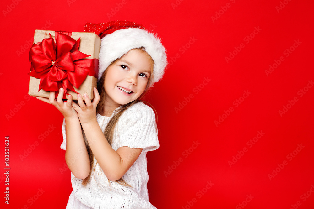 Happy smiling girl in Christmas cap holding Christmas gift in craft paper and with a red bow on a red background. Sale. Black friday. Shopping. Merry Christmas