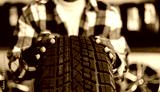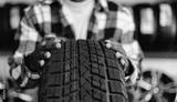 Closeup winter tyre, African male adult holding new car tire in auto shop